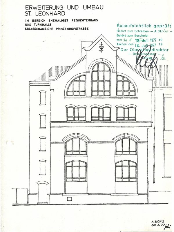 Teil der Ausführungszeichnungen (Straßenansicht Prinzenhofstraße) mit Genehmigungsstempel vom 18. Juli 1977 zum Umbau des Kulissenhauses.